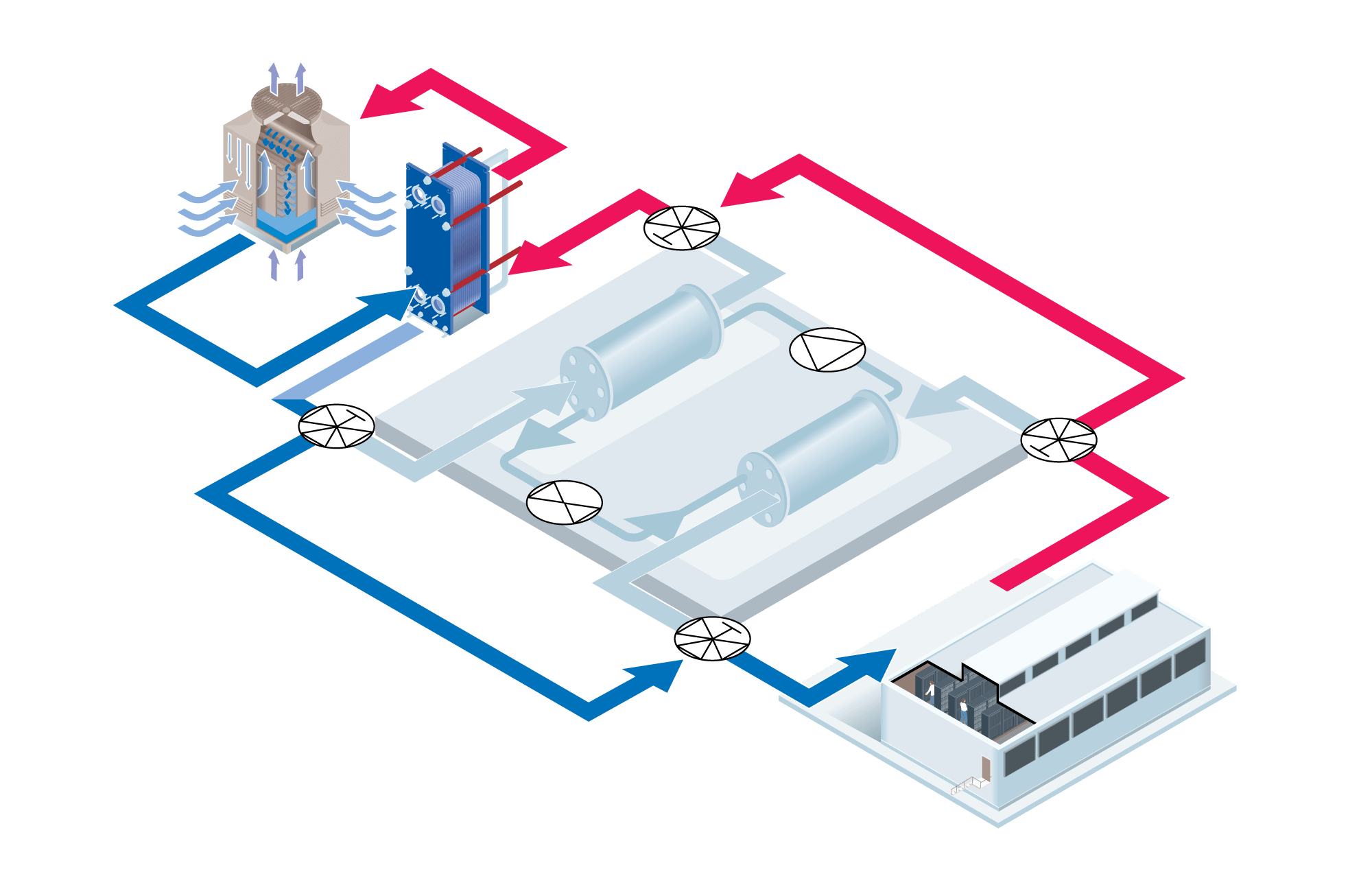 Uzun soğuk hava dönemlerinde serbest soğutma imkanı, soğutucunun kapatılabileceği ve potansiyel olarak binlerce Euro tasarruf edilebileceği anlamına gelir. Bu uygulama, soğutma grubunun kapatılabileceği süreyi en üst düzeye çıkarmak için mümkün olan en yakın sıcaklık yaklaşımıyla tasarlanmış contalı plakalı ısı eşanjörü gerektirir. Açık bir soğutma kulesi kullanıldığında, ısı eşanjörü aynı zamanda bir ara eşanjör işlevi görerek kondenseri istenmeyen döküntülerden ve kalsiyum karbonat oluşumundan koruyabilir. Bunu yapmak güç kullanım etkinliğini (PUE) %7 oranında azaltır.