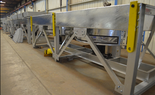 Three large two-fan Model E coolers shown in one of the assembly lines at Alfa Laval ACE's Broken Arrow, Oklahoma, facility.
