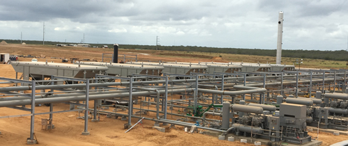 Six large ACE Model E-air cooled exchangers support a large central gas gathering pipeline compressor station.