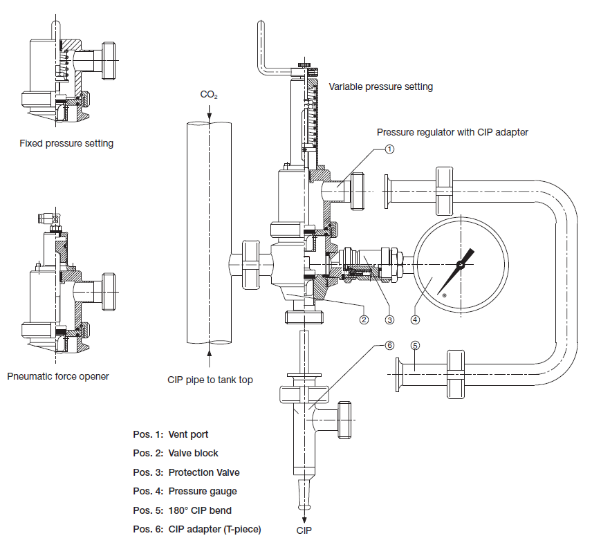 Basınç regülatör tankı her parti arasında temizlenmelidir. Bu işlem, isteğe bağlı CIP adaptörü vasıtasıyla tank CIP prosedürüne dahil edilmiştir. Temizlemeden önce, CIP adaptörü tank basınç regülatörüne takılır, gaz besleme vanasını ve basınç tahliye vanasını zorla açar ve bunların tamamen temizlenmesini sağlar. CIP prosedürü sırasında tüm fonksiyonlar bloke edilir. Regülatörün şematik çizimine göz atın.